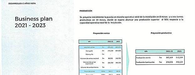 Entrando en materia económica, el informe aportado por Cristian Lay incluye lo que presenta como un 'Business plan 2021-2023'. En ese apartado, el grupo industrial plantea una serie de objetivos. Por ejemplo, en cuando a la producción, la aspiración para el periodo 2021-2022 era de 307.109 toneladas de acero y de 296.076 de laminación, que pasarían un año después a ser 513.209 y 490.124, respectivamente.