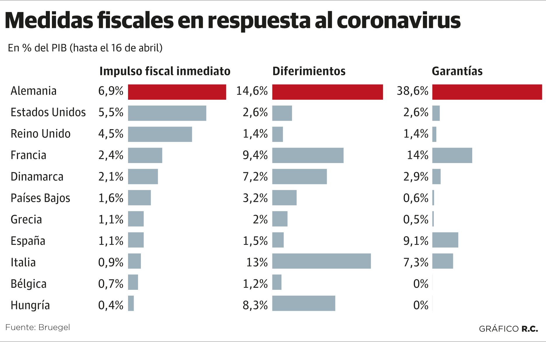 También destaca Francia, especialmente por sus moratorias tributarias de 228.000 millones de euros y sus avales por valor de 337.000 millones de euros, ya que su respuesta fiscal ha sido más discreta.