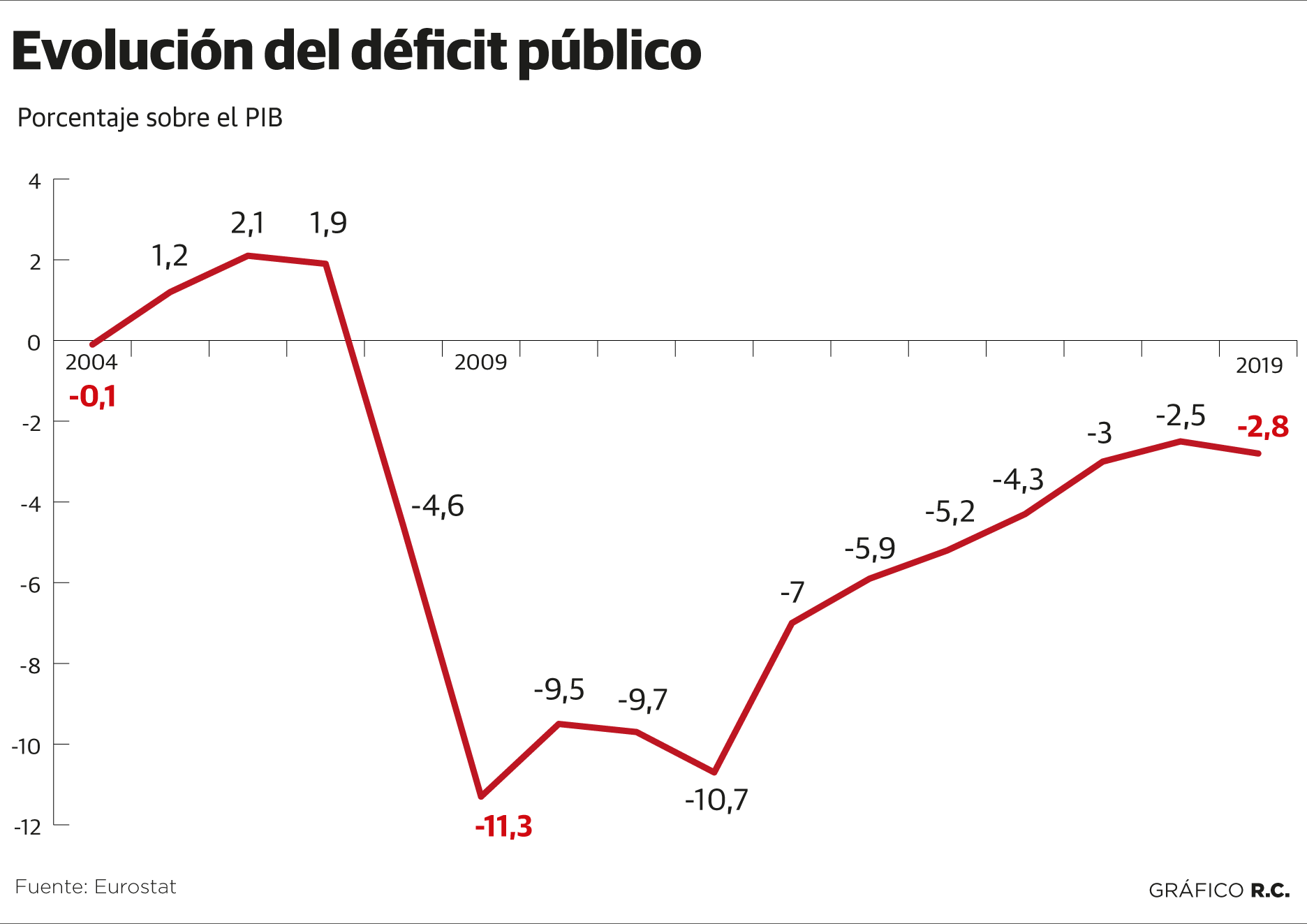 Si el déficit se amplía ocho puntos, hasta el 11%, que prevé el Banco de España en su peor escenario, el reparto será casi a partes iguales entre la caída de ingresos por el hundimiento de las bases fiscales y el aumento del gasto público. Con datos de PIB de 2019, el impacto en ingresos y gastos sería de alrededor de 50.000 millones.