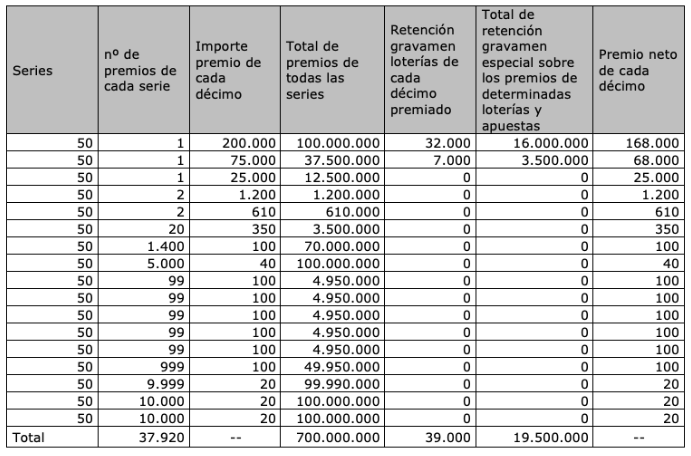 Los técnicos recuerdan que, en total, se repartirán 700 millones de euros, de acuerdo a los datos facilitados por la Sociedad Estatal de Loterías y Apuestas del Estado (SELAE). Así como que este sorteo sólo grava los dos primeros premios; que ascienden a 200.000 y 75.000 euros, respectivamente. De esta manera, la pérdida de recaudación por cada uno de los décimos afortunados con los dos primeros premios será de 4.000 euros y con los del tercer premio, que este año no tributa, de 1.000 euros, por lo que los afortunados recibirán en este caso los 25.000 euros íntegros.