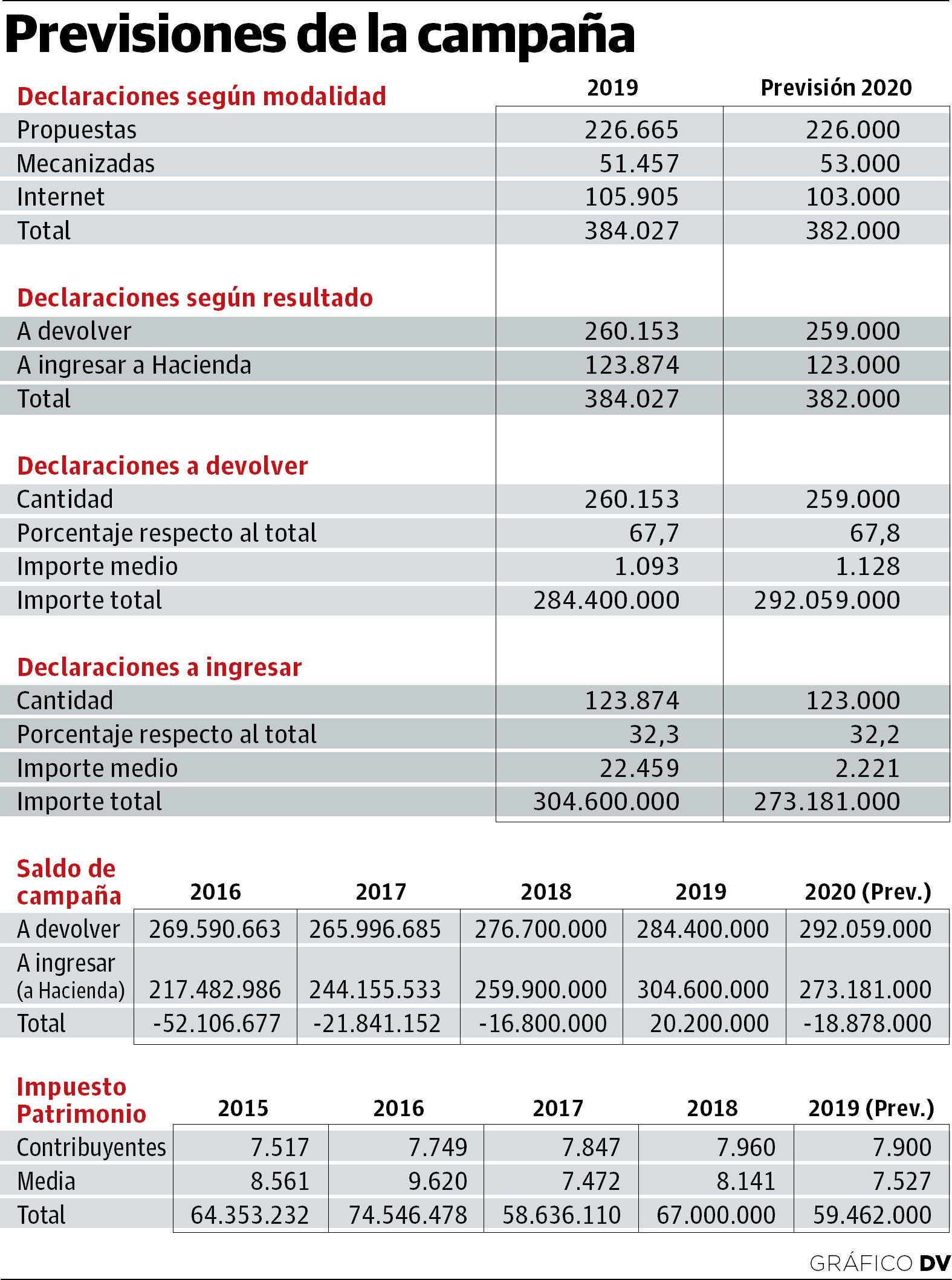 Según las previsiones, Hacienda prevé recibir 2.027 declaraciones menos que el año pasado, hasta un total 382.000. Según la modalidad, se presentarán 226.000 propuestas (665 menos que el año pasado), 53.000 en las oficinas de mecanizada (1.543 más que el año anterior) y 103.000 'online', a través de la plataforma Zergabidea (2.905 menos que el año anterior). Según el resultado, 259.000 declaraciones serán a devolver, el 67,8% del total, y recibirán una media de 1.128 euros por contribuyente.