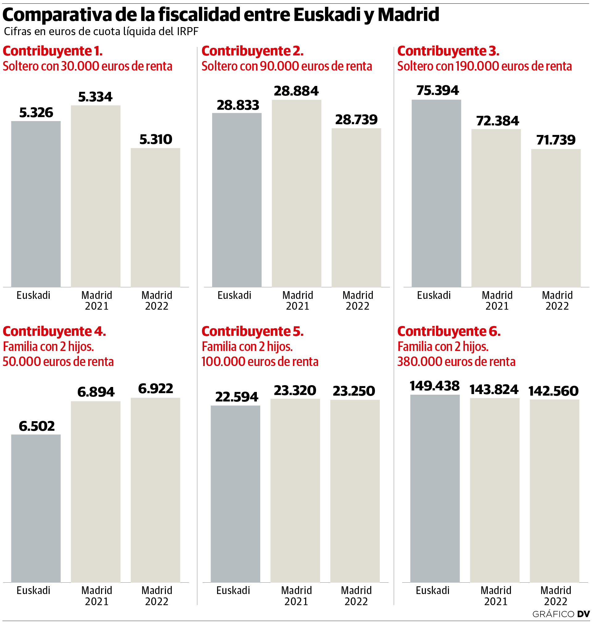 Volviendo a la pregunta original, ¿es el sistema tributario madrileño más competitivo que el vasco? DV ha querido poner negro sobre blanco y, con la ayuda del despacho donostiarra BSK Legal & Fiscal, se han realizado los cálculos de cuánto pagan solteros y familias con dos hijos en Madrid y en Gipuzkoa ahora y cuánto lo harán a partir del año que viene, cuando entre en vigor la rebaja madrileña –ver tabla adjunta–.