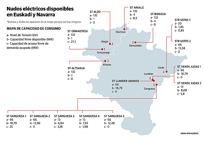 El contraste lo pone Navarra, que en esta primera publicación aparece con catorce nudos disponibles, repartidos entre Alsasua, Doneztebe, Sangüesa, Lumbier y Navascués, con un volumen de potencia que multiplica por varias veces la escasa oferta guipuzcoana. Es una diferencia que, en términos prácticos, significa que proyectos que en Euskadi hoy se bloquean, al otro lado de la muga administrativa pueden encontrar salida.