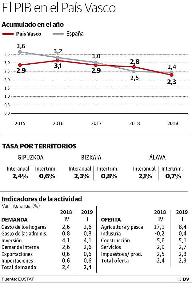 Pese a las incertidumbres que se ciernen en el ámbito internacional, la economía vasca está capeando el temporal mejor de lo previsto, ya que ... ha crecido en el primer trimestre a mayor ritmo del estimado, un 2,3% interanual, con Gipuzkoa a la cabeza, que avanza una décima más. Una evolución que ha sorprendido gratamente al Ejecutivo de Iñigo Urkullu hasta el punto de que el consejero de Hacienda y Economía, Pedro Azpiazu, avanzó ayer que no descarta revisar la previsión del año, que su gabinete había situado en el 2,2%.