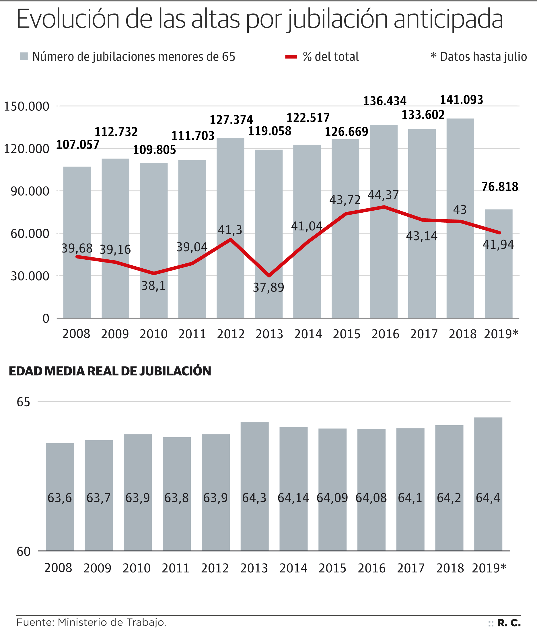 Es más, en la última década cerca de millón y medio de trabajadores accedieron a la jubilación con menos de 65 años, según datos del Ministerio de Empleo, Migraciones y Seguridad Social. Concretamente, 1.348.044 entre 2008 y 2018, a los que se suman 76.800 en los primeros seis meses de 2019. Precisamente el año pasado se alcanzó la cifra más elevada de la historia: alrededor de 142.000 personas pasaron a ser pensionistas del Estado sin haber cumplido la edad legal, lo que supone casi un 32% más que las registradas en 2008, al inicio a de la crisis.