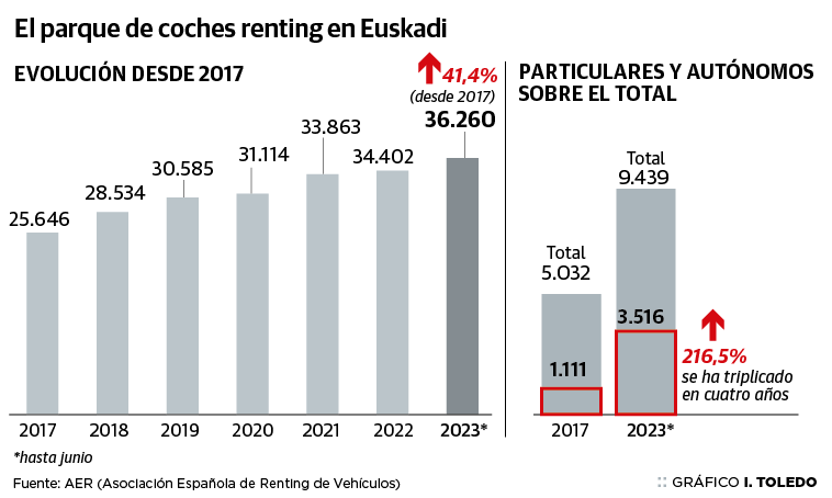 El renting de coches ya no es solo para las empresas. El número de particulares vascos que optan por esta alternativa para hacerse con un ... automóvil sigue creciendo de año en año y desde 2017 ya se ha multiplicado por tres. Según se desprende de las estadísticas de la Asociación Española de Renting de Vehículos (AER), a 30 de junio de este año había en Euskadi un total de 3.516 personas que eran titulares particulares de 3.609 vehículos en esta modalidad, más del triple de las 1.111 que había en 2017. Y es que del conjunto de clientes de renting que hay en el País Vasco, los conductores a título individual representan ya el 37,1% del total de titulares, empresas incluidas, frente al 22,1% de hace seis años.
