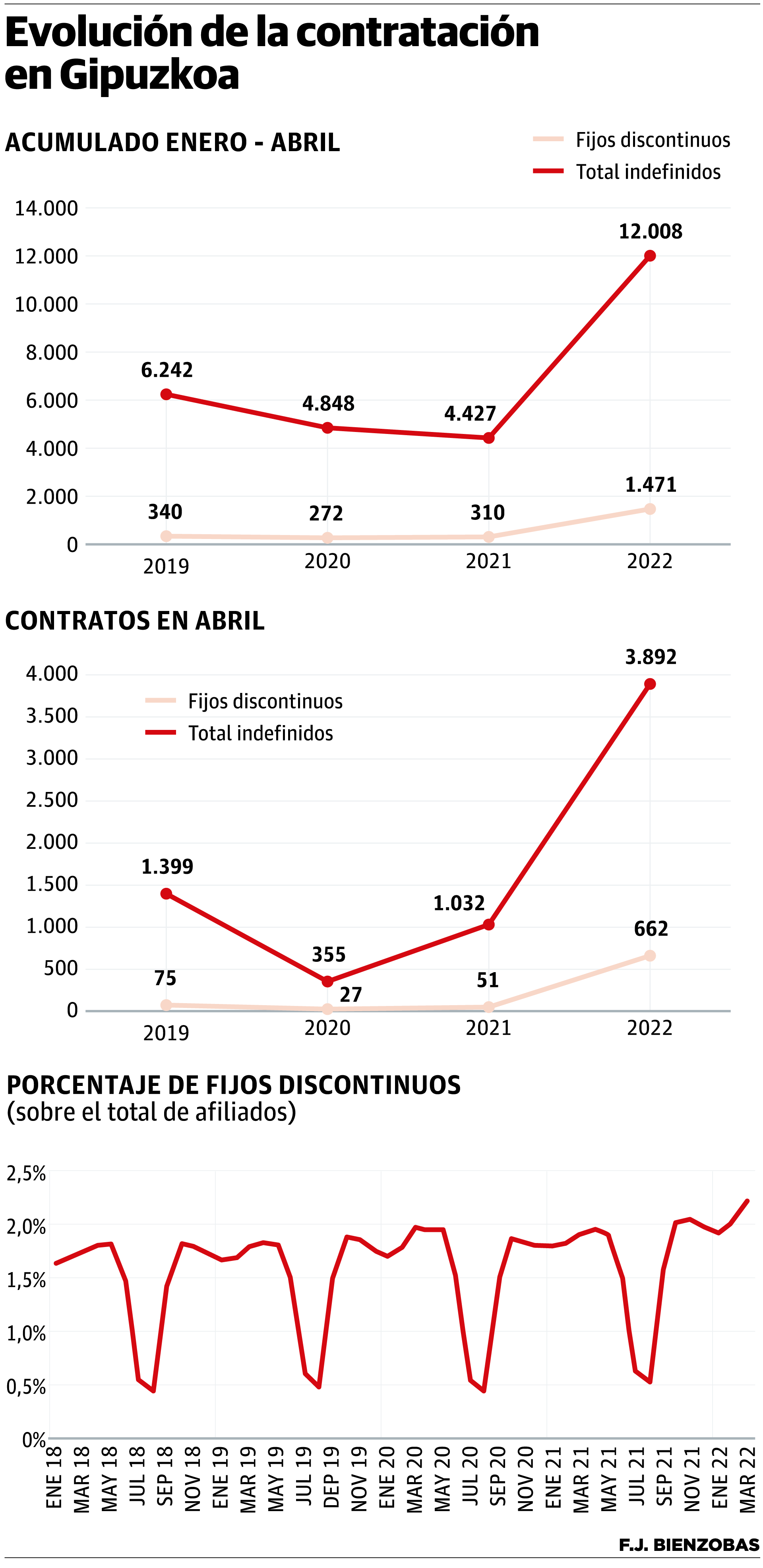 Aunque la reforma entró en vigor en enero, desplegó todos sus efectos en abril. De hecho, en dicho mes, los contratos fijos discontinuos se multiplicaron por trece en Gipuzkoa en comparativa interanual, al realizarse un total de 662 contratos de este tipo frente a los 51 de un año antes. Si la comparativa se hace con 2019, año precovid, y con niveles similares de actividad laboral –aunque este año se ha superado la afiliación–, supone que se han multiplicado por nueve, ya que en dicho ejercicio se suscribieron 75 contratos fijos discontinuos.