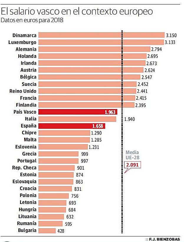 En el grupo de cabeza se encuentran Dinamarca, Luxemburgo y Alemania, por ese orden -ver gráfico adjunto-. Comparados con los daneses, los vascos cobran 1.187 euros brutos menos al mes. Y si nos fijamos en los alemanes, un país que suele servir de referencia cuando se habla de competitividad de las empresas vascas y también de los salarios, la distancia es de esos 831 euros antes mencionados, lo que supone 9.972 euros al año.