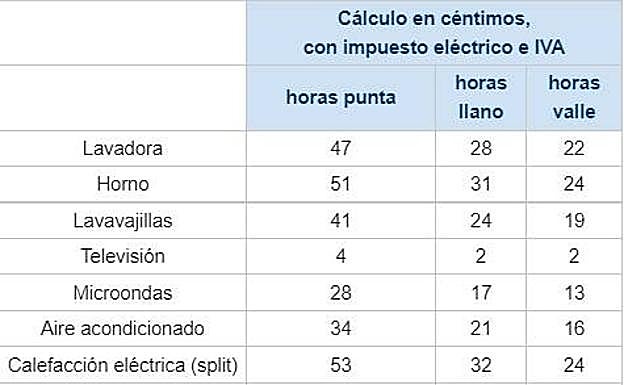 Tras esta excepción, la lavadora (47 céntimos), el horno (51 céntimos) y la calefacción eléctrica o split (53 céntimos) son, según la consultora Selectra, los tres electrodomésticos que más luz gastan en horas punta. El cálculo de la tabla que pueden ver aquí en la imagen inferior se expresa en céntimos, e incluye el impuesto eléctrico y el IVA. Por detrás quedan el lavavajillas (41 céntimos en hora punta), la secadora (37 céntimos), el aire acondicionado (34 céntimos), la plancha (28 céntimos), el microondas (28 céntimos), el ventilador de techo (16 céntimos) y la televisión (4 céntimos).