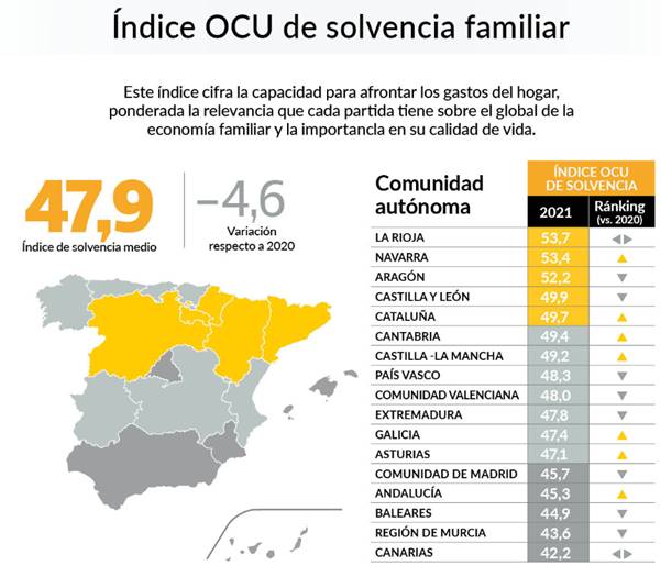 Otro dato curioso que arroja la encuesta de la OCU es la pérdida de posiciones de Euskadi en esa tabla de bienestar y solvencia por comunidades autónomas. El País Vasco ha salido del 'top 5' de comunidades con las familias con mayor solvencia económica. En la nueva clasificación, la comunidad ha perdido tres posiciones y se encuentra en octava posición, por detrás de La Rioja, Navarra, Aragón, Castilla y León, Cataluña, Cantabria y Castilla-La Mancha.