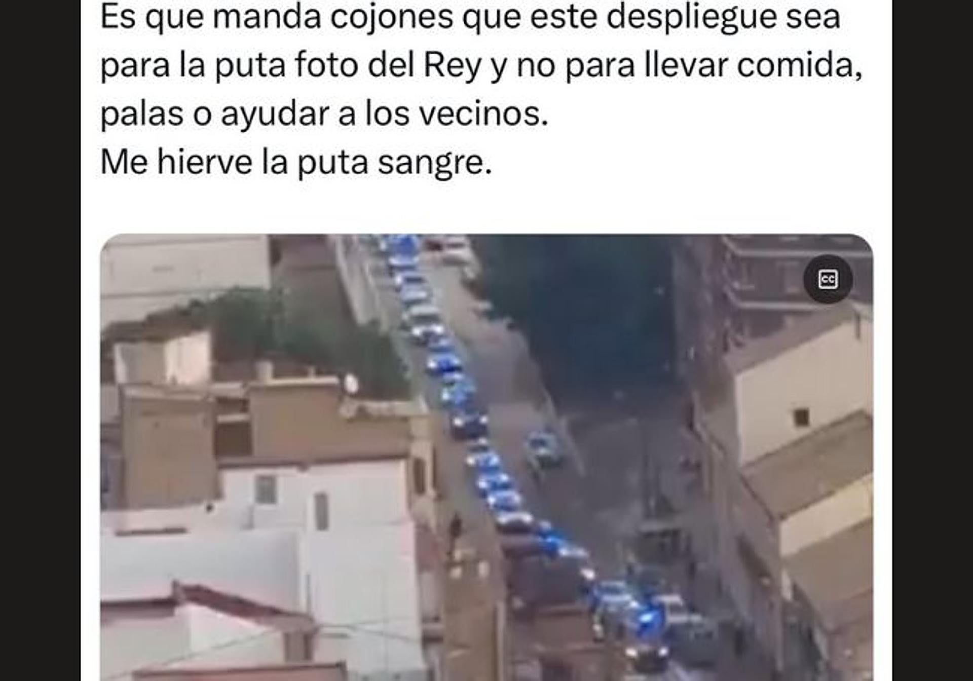 Relacionado con dichos incidentes está otro de los bulos más extendidos en las últimas horas, el que habla de un despliegue «desmedido» de vehículos policiales para la escolta de dicha visita. La propia Policía Municipal de Madrid se ha encargado de explicar la realidad: «Es nuestro convoy, saliendo para sus correspondientes destinos a Torrent, Massanassa, La Torre, Alfafar y Sedaví; no hemos ido de escolta sino a ayudar».
