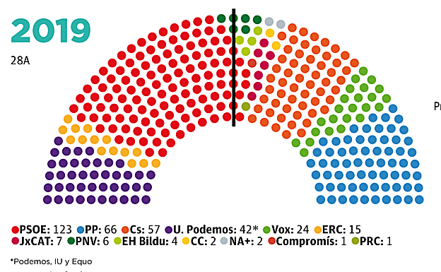 La noche del 28 de abril todo parecía decantado a un Gobierno progresista. El PSOE había ganado las elecciones y Unidas Podemos retrocedido, pero la suma de ambas fuerzas superaba ampliamente a la derecha. La gran pega fue que la izquierda necesitaría de ERC para superar la investidura. Pedro Sánchez decidió tomarse su tiempo hasta la celebración de las municipales, autonómicas y europeas un mes después. El panorama cambió tras estos comicios. El batacazo de los de Pablo Iglesias y la amplia victoria socialista llevó a pensar en Ferraz que ya no había necesidad de compartir Consejo de Ministros con Unidas Podemos. La situación, por lo reciente, es de sobra conocida. Una negociación exprés a finales de junio que acabó con una propuesta de coalición con el PSOE que Iglesias rechazó al considerar que la vicepresidencia y los tres ministerios que se les ofrecían carecían de competencias reales. La investidura de Sánchez decayó y ya no hubo más que hablar. Ni Sánchez ni Iglesias se movieron un milímetro de sus posiciones y en septiembre se convocaron de forma automática las cuartas elecciones generales en cuatro años.