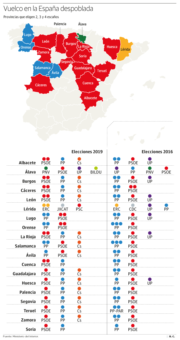 Con el vuelco, los socialistas, que en 2016 no lograron ganar ni en un territorio de la España vacía, se convirtieron el domingo en primer partido en 13 de las 19 provincias. Los populares, que hace tres años mandaban en 17 de los 19 territorios -todos menos Lérida y Álava-, solo son ya primera fuerza en Lugo, Orense, Salamanca y Ávila. El nuevo liderazgo socialista de la España vaciada le permitió llevarse dos escaños en 7 de las 10 provincias que eligen cuatro diputados, con los que elevó su representación en ocho escaños (un 42%), hasta los 27 asientos.