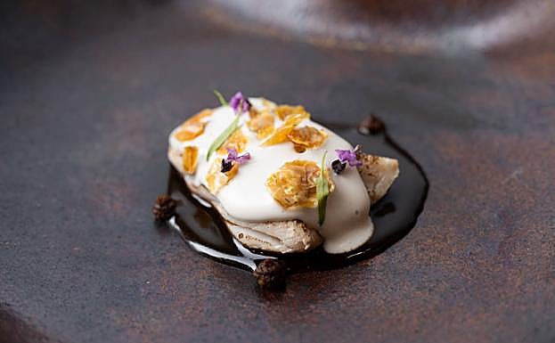 El segundo plato es del calamar, una especie que «solo se acerca tres semanas al año en Tenerife. No tenemos barcos que los pesquen. Hemos conseguido que ciertos pescadores recuperen artes de pesca olvidadas, para conseguir el calamar por la noche y nos llega en dos horas», explica Bosch, cuyos platos «no suelen tener más de tres o cuatro elementos». En este inoculan la espora del koji en la papa canaria porque «le gusta mucho el almidón». Cuatro meses después trasforma almidones en dulce, lo que refuerza el sabor del calamar, junto a un caldo de cebollas y jengibre. «Cocinamos a través del hongo, incorporamos los matices para lograr puro umami en la boca», explica Domínguez.