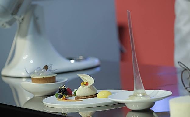 Y con la leche como protagonista no puede faltar un postre con nata, de la que Paco Torreblanca desveló que «debe ser muy fina, muy estable y casi como un merengue». La forma de conseguirlo es 'sencilla' y se le ocurrió a su hijo Jacob. «Hay que montar la nata fría e incorporar trozos de nata congelada (montada previamente), para conseguir esta textura» de la que hablaba su padre. Así nace un postre de yuzu con bavaroise de vainilla con bizcocho de pistacho y decoración de caramelo. Una maravilla para los sentidos.