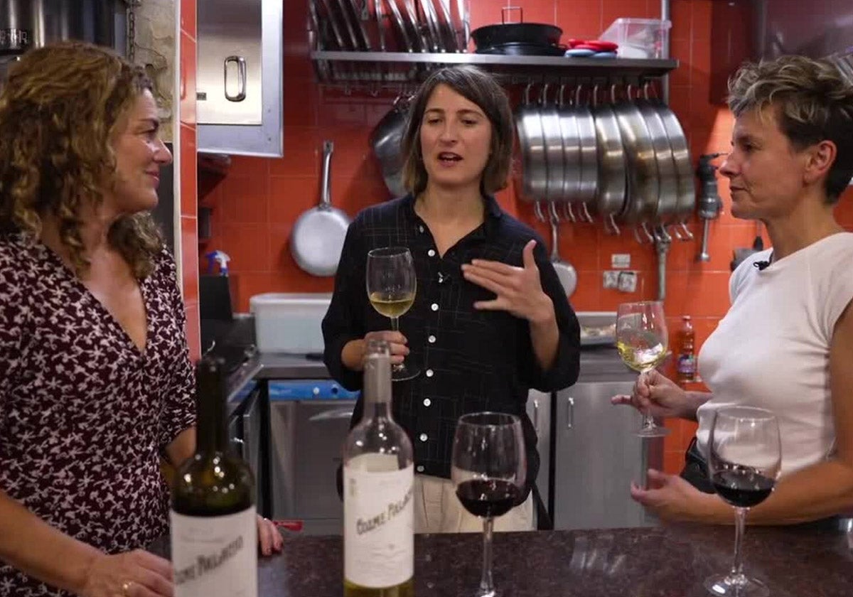 De los dos vinos seleccionados, uno blanco y otro tinto, comenzaron catando el Cosme Palacio Blanco 2019. A juzgar por Larrañaga es un vino en el que «la madera está muy bien integrada. Tiene persistencia, lo que le da un poco de empaque y de estructura, pero, a su vez, no pierde esa fruta tan rica. Es muy equilibrado». La sumiller y jefa de sala de Laia Erretegia (Hondarribia), Arantza Ayala, agregó que se trata de un caldo «agradable» que en boca «mantiene la frutosidad, con final un poco largo».