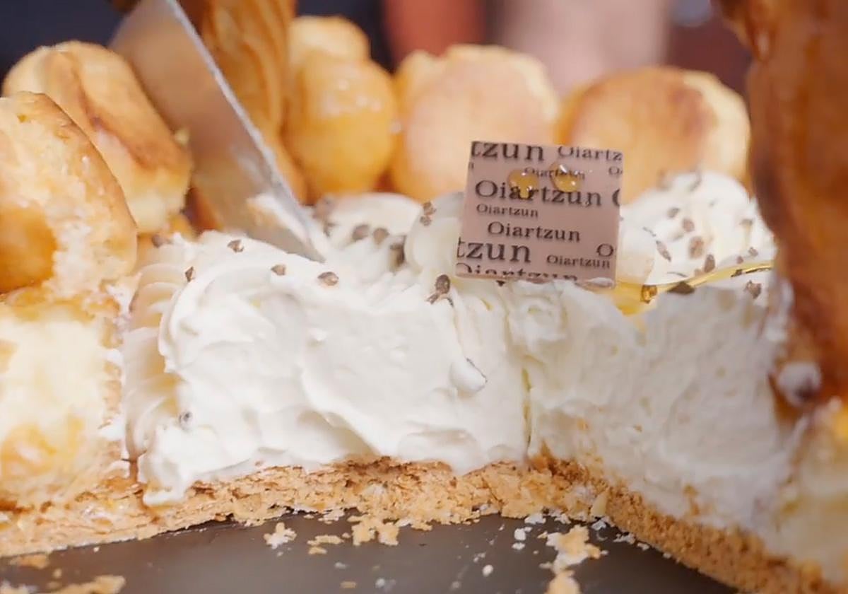 Pastelería Oiartzun puso el colofón a la comida que 'A Mesa Puesta' ofreció en la sociedad Itzalpe para conjurarse para la remontada ante el PSG con un postre tan francés como el propio Mbappé: el Saint Honoré que elabora el equipo de David Martín en la pastelería donostiarra.