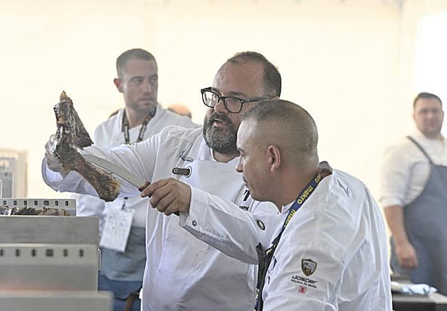 10. Roberto Ruiz sirviendo alubias, cuajada y txakoli a sus amigos en el backstage de su comedor portátil, y Ramon Saizarbitoria, la leyenda, de jurado del concurso de parrilla.