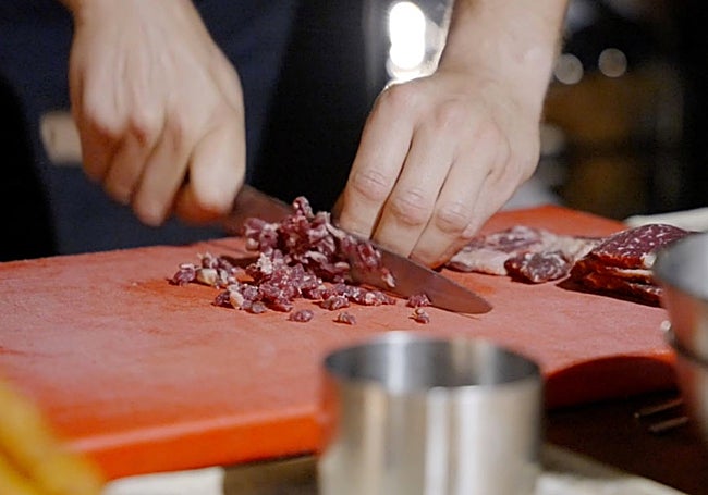 Imanol arranca la elaboración de esta receta limpiando el lomo bajo hasta quedarse con el taco principal. A continuación, corta la pieza en brunoise, siempre con un cuchillo muy afilado para que la carne sufra lo menos posible. El resultado tiene que ser unos tacos pequeños de este lomo bajo.