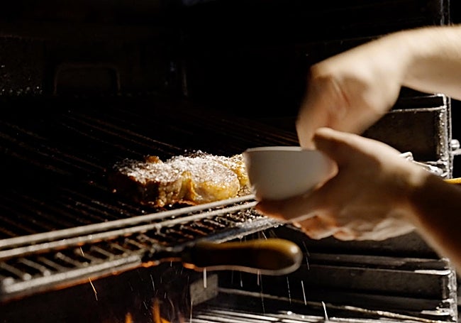 Mientras la txuleta sigue asándose sobre la parrilla inclinada, añadir la sal a la pieza de carne.