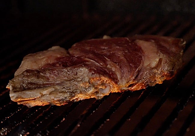 Xabier Ruiz explica que, en esta ocasión, es un asado mucho más suave, con una mayor distancia entre la pieza de carne y el carbón. El objetivo es encontrar una brasa pausada y uniforme. El parrillero resalta que este tipo de txuletas de Cárnicas Goya tiene mucha infiltración, lo que provoca mucha gota, incluso cuando se ha retirado previamente toda la grasa exterior.
