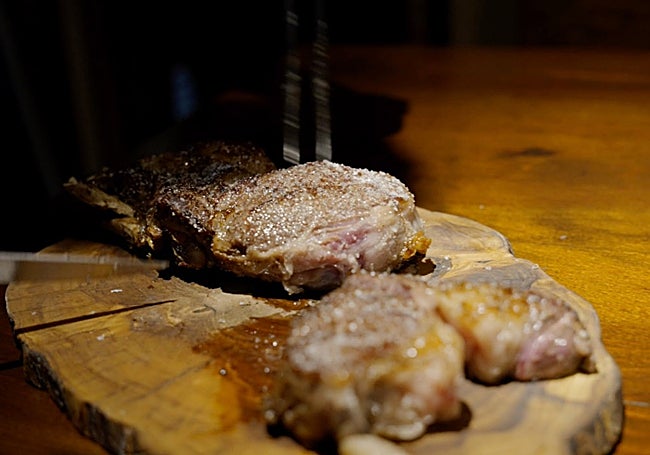 Cortar la txuleta sobre una tabla de madera para su presentación.