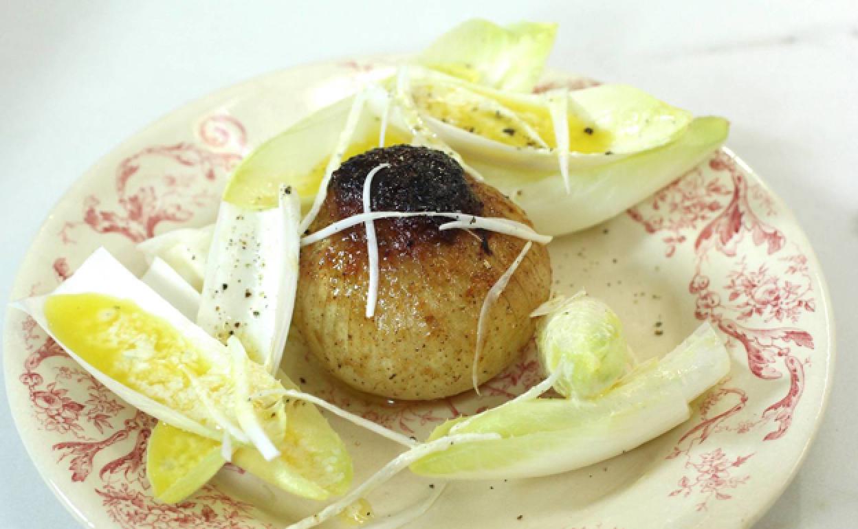 Servir las cebollas con una ensalada de endivias aliñada con vinagreta en tarro + cebolleta.