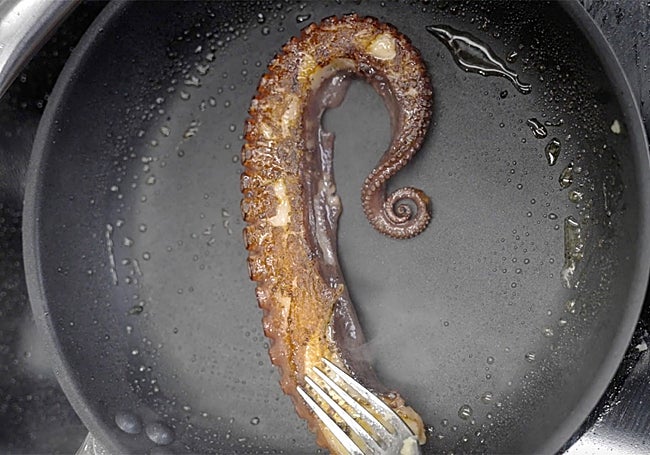 Con diferentes opciones de punto, que podrá elegirse al gusto, cocinamos el vuelta y vuelta durante un par de minutos, hasta que quede dorado. Una vez retirado del fuego, trinchamos el pulpo y podremos comprobar que está jugoso.