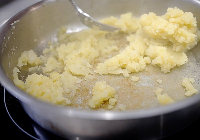 Con la patata previamente cocida, se pone sobre una sartén para ir rompiéndola, poco a poco, con ayuda de un tenedor y echándole un poco de aceite de oliva y dándole un toque de sal. Según se vaya trabajando, iremos viendo cómo la textura cambia completamente a una patata cremosa. Hay que tener mucho cuidado de que no se agarre.