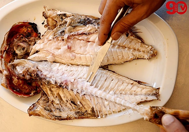 Una vez retirado el besugo de la parrilla, lo dejamos reposar dos minutos para que se termine de hacer con el calor residual. Pasado ese tiempo, lo abrimos empezando por la cola y hacia la cabeza. Con ayuda de un cuchillo, lo abrimos como un libro y quitamos la espina central.