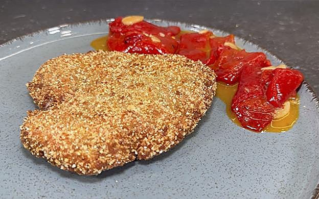 En un plato ponemos el cachopo acompañado de unas cucharadas de pimientos.