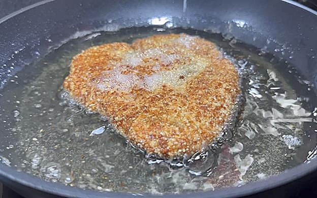 Pasamos la carne por harina, por huevo batido y por último por pan rallado. En una sartén ponemos aceite de girasol y freímos el cachopo por ambos lados hasta que esté dorado.