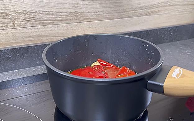 En un cazo ponemos dos cucharadas de aceite de oliva y añadimos los dientes de ajo laminados. Cuando empiecen a dorarse añadimos los pimientos y también su jugo, una pizca de sal y un chorrito de vinagre. Subimos el fuego y removemos de vez en cuando hasta que el jugo empiece a desaparecer. En unos 7 minutos estarán listos.