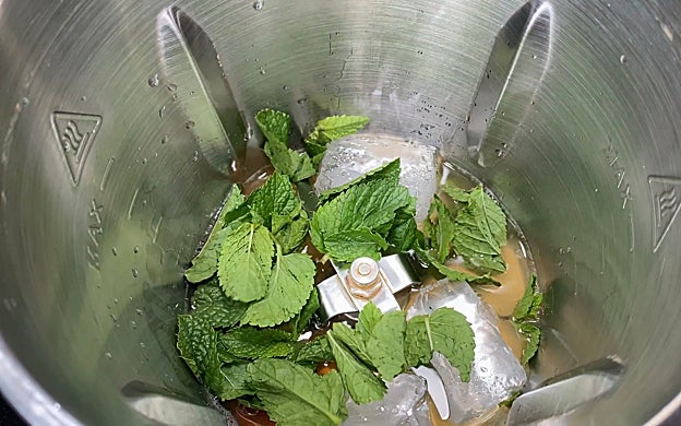 Añadimos al robot de cocina el hielo, el zumo de media lima, el azúcar moreno, la soda, el ron y la hierbabuena. Trituramos durante unos 30 segundos.