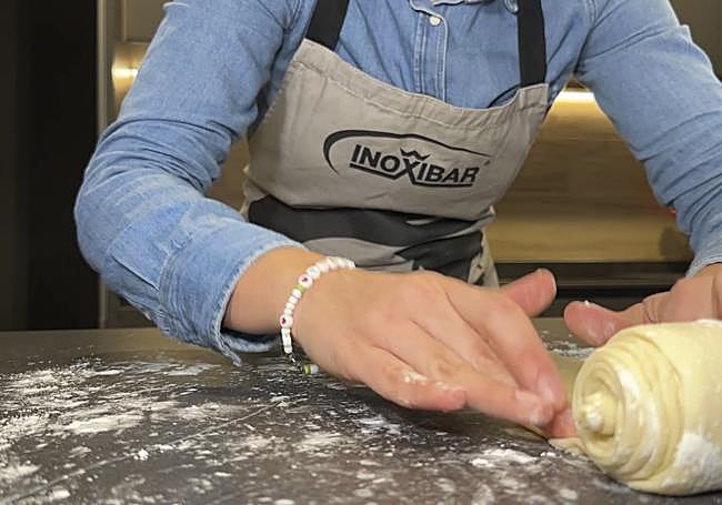 En una superficie enharinada colocamos la lámina de hojaldre. Hacemos cortes de unos 5 centímetros con el cortapizzas de extremo a extremo. Vamos enrollando cada tira sobre sí misma pegando con los dedos el final de una con el inicio de la siguiente. Intentamos que no queden huecos en el interior. Cortamos los extremos que hayan quedado desiguales.