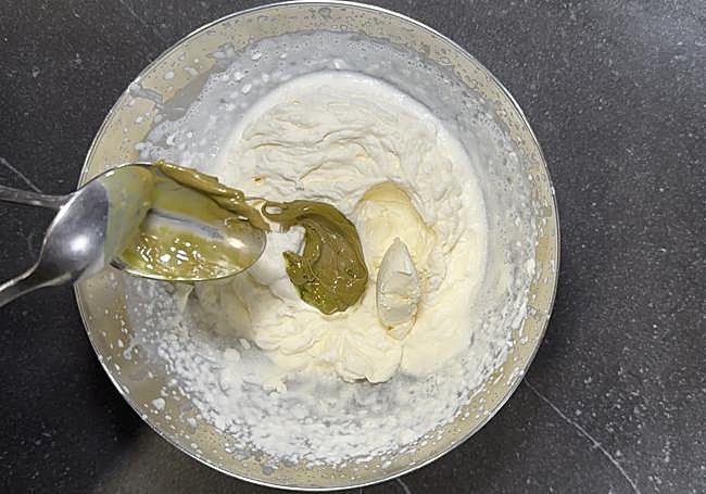 En un bol ponemos 200 ml de nata fría y 30gr de azúcar. Batimos hasta montar la nata, añadimos la crema de pistacho y volvemos a batir.