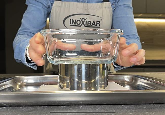 Colocamos el rollito en el centro de un molde y encima le ponemos algo que le aporte peso para que impida que suba la masa. Lo metemos al horno a 200°C durante una hora y cuarto.
