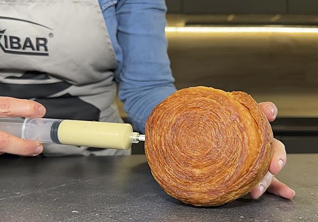 Con ayuda de una jeringuilla inyectamos la nata en el centro del rollito por dos o tres puntos diferentes. Colocamos también por la parte superior y añadimos para terminar unos pistachos machacados.