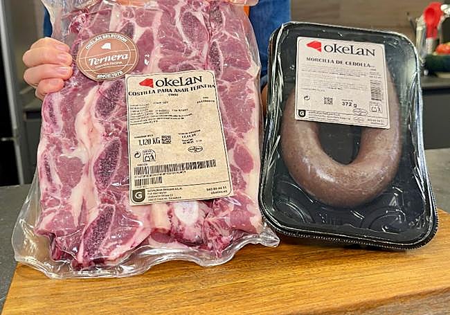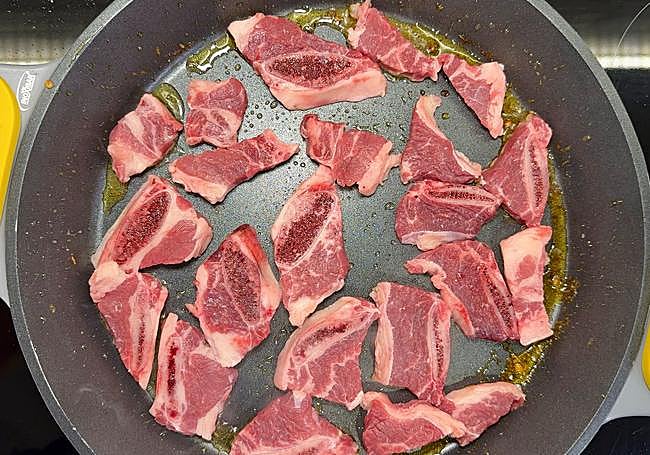 Comenzamos cortando 3 tiras de costillas por donde marca el hueso y la morcilla en trozos aproximadamente iguales. Cortamos la patata en rodajas de un dedo de grosor y hacemos lo mismo con el tomate.