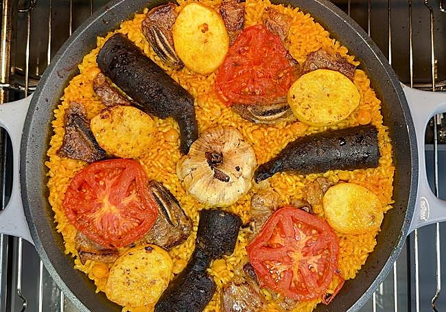 En una paellera o cazuela apta para horno, ponemos un chorrito de aceite de oliva Virgen Extra y colocamos una cabeza de ajos abierta hacia abajo. Continuamos dorando las patatas y el tomate por las dos caras, con una pizca de sal. Retiramos y cocinamos también la costilla hasta que coja color y reservamos. Rehogamos los garbanzos, con una cucharada de pimentón y tomate triturado. Añadimos el arroz, mezclamos con los garbanzos y presionamos ligeramente para extenderlo por toda la base.