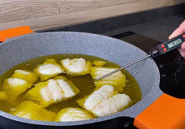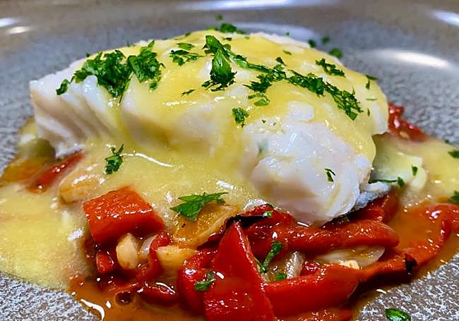 Ingredientes y elaboración de bacalao confitado con pimientos y pilpil de Pescadería Gines