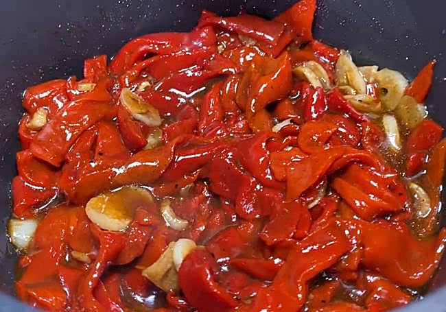 Mientras tanto, en un cazo ponemos 4 dientes de ajo cortados en rodajas con una cucharada de AOVE. Cuando los ajos estén dorados añadimos un bote de pimientos en conserva. Le ponemos sal al gusto y un chorrito de vinagre de Módena. Ponemos la tapa y subimos el fuego. Mantenemos unos 5 minutos a fuego alto hasta que veamos que empieza a consumirse el jugo. Cuando esto pase apagamos el fuego.