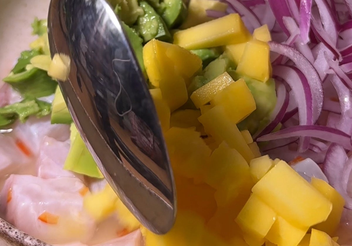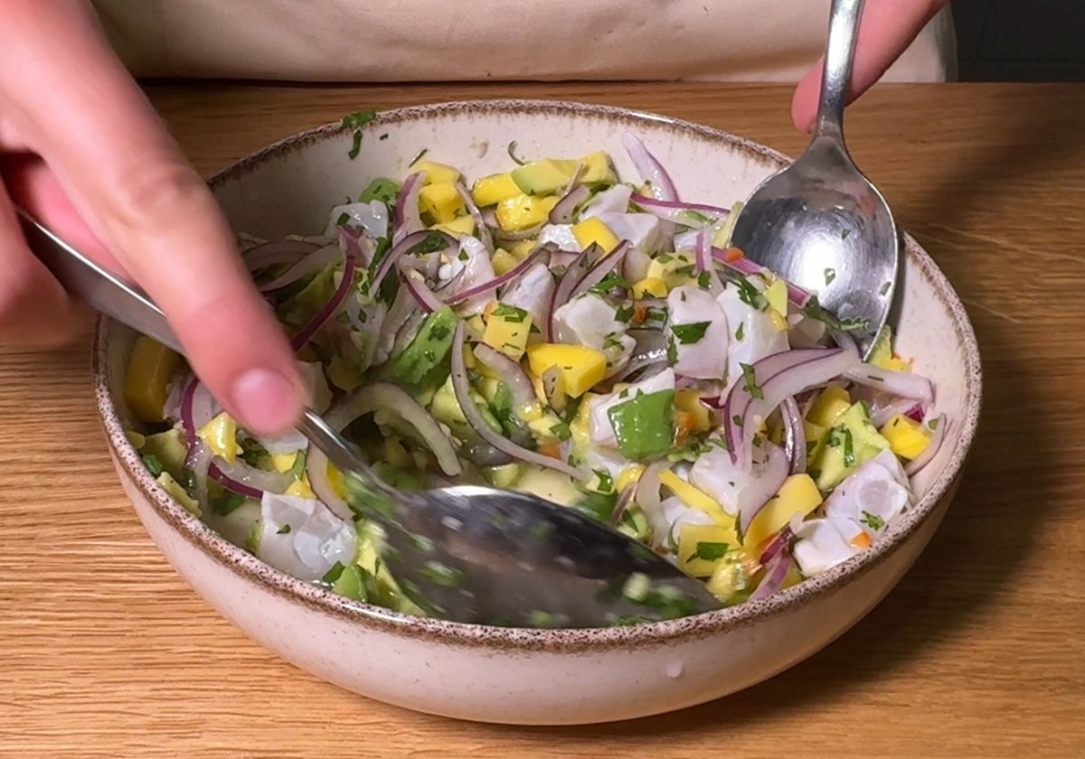 Corta aguacate y mango en dados pequeños y echa sobre el pescado marinado. Añade también la cebolla bien escurrida.