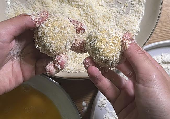 Saca la mezcla de la nevera y forma las bolas. Pasa por harina, huevo y pan rallado o panko.
