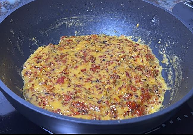 En el mismo fuego, pocha el pimiento picado. Cocina unos 10 minutos. Después añade la mantequilla y déjala derretir poco a poco, que vaya cogiendo el sabor y el color del pimiento.