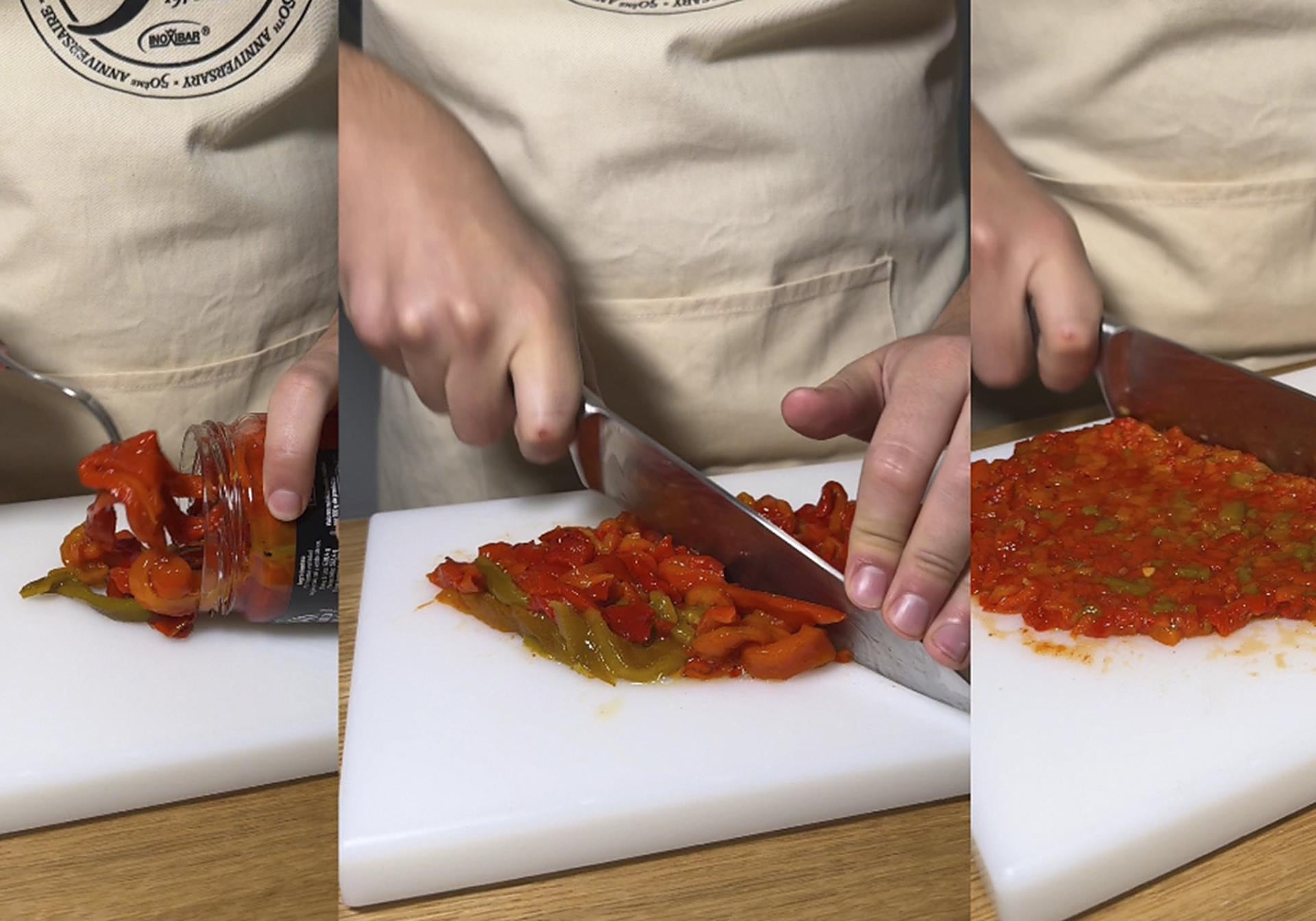 Empezó picando los ajos y los piquillos. Tienes que dedicarle tiempo, que quede todo muy picado.