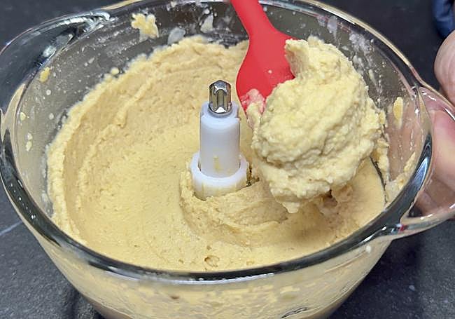 En un vaso batimos los garbanzos, un diente de ajo, el tahini, el zumo de limón, el comino, unos 80 ml de agua y sal. Agregamos más agua si ha quedado demasiado espeso.