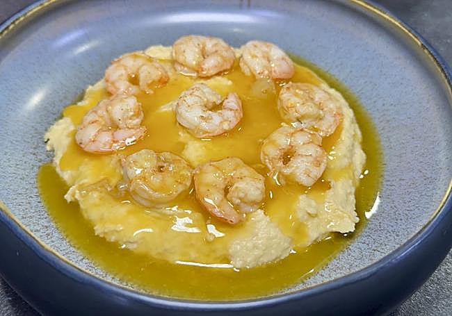 Ingredientes y elaboración de hummus con gambas al ajillo de Pesacería Ginés