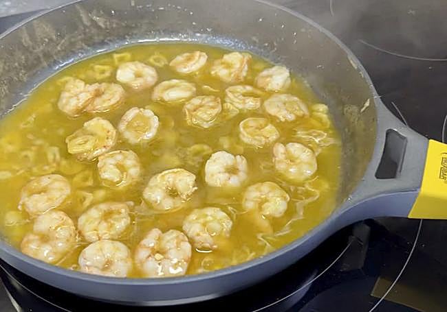Pelamos las gambas, las limpiamos y reservamos las cabezas. Laminamos 5 dientes de ajo y los doramos en una sartén con un buen chorro de aceite de oliva virgen extra. Añadimos las gambitas cuando dejen de estar transparentes, incorporamos el jugo de las cabezas emulsionado con aceite. Removemos para que se integre bien con las gambas.