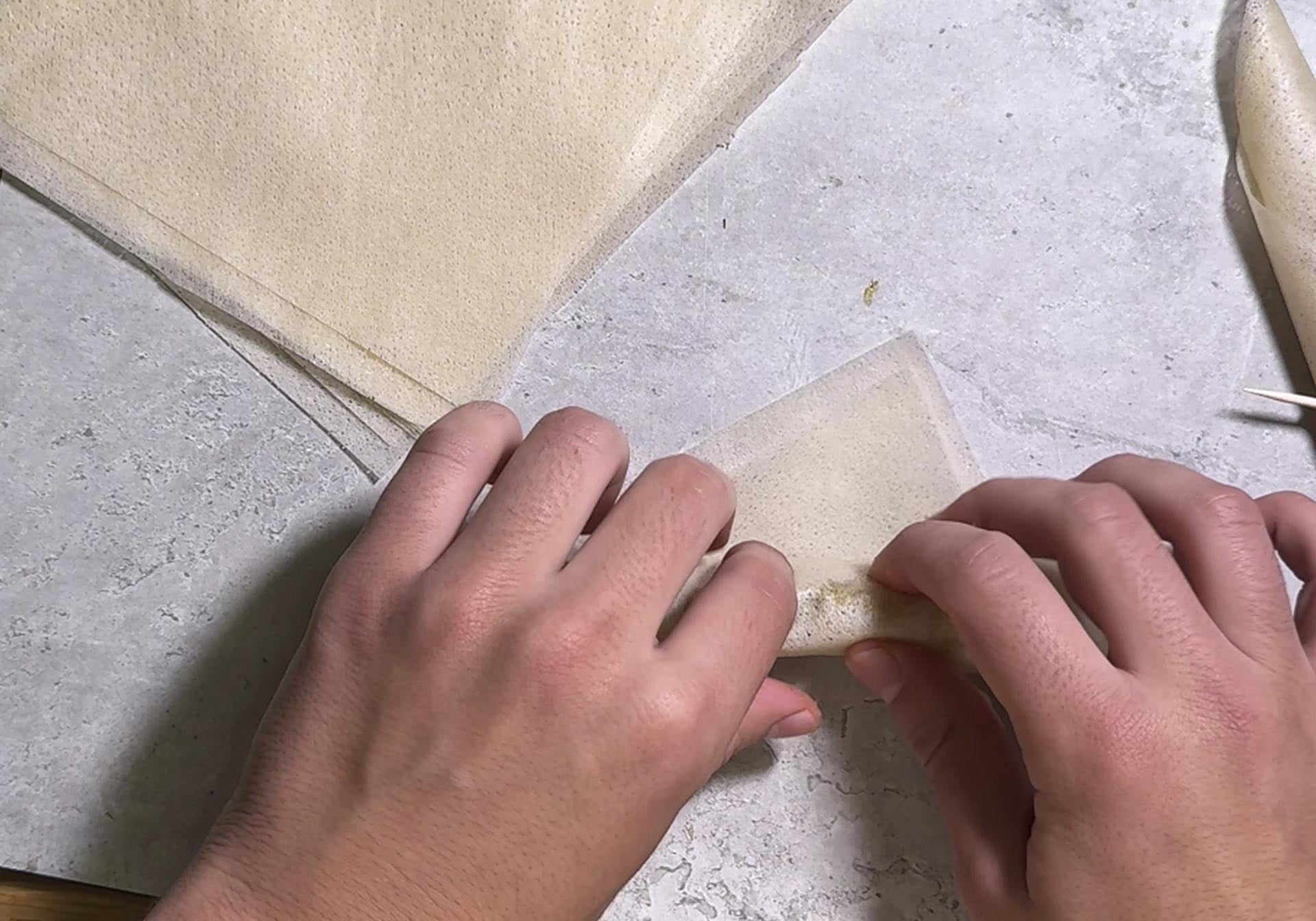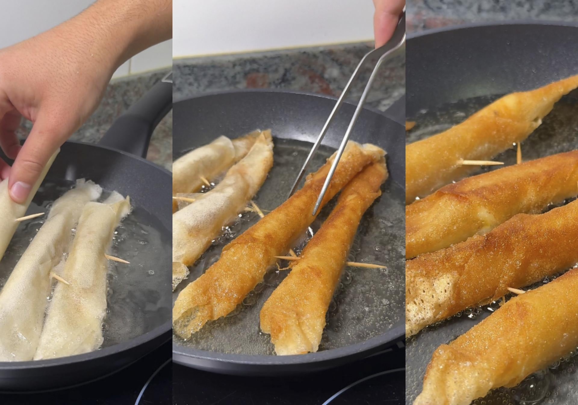 Da forma cogiendo 2 láminas, rellenando con un langostino y envolviendo sobre él haciendo una especie de churro. Cierra con la ayuda de un palillo, que a su vez, sujetará el langostino.